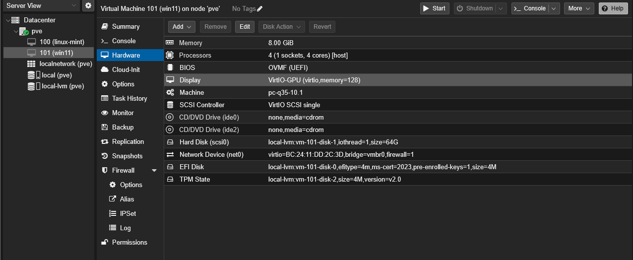 After installing virtio-win, shutdown and verify Proxmox’s Hardware > Display is set to VirtIO-GPU.