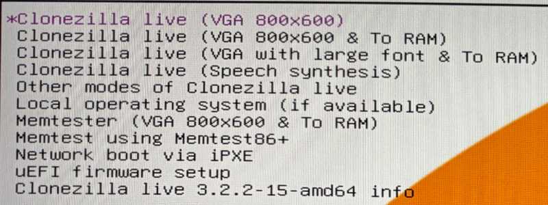 At the GRUB boot menu, select Clonezilla live (VGA 800x600)