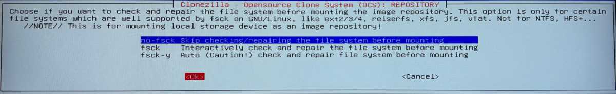 no-fsck Skip checking/repairing the file system before mountingWhich directory is for the Clonezilla image repository?