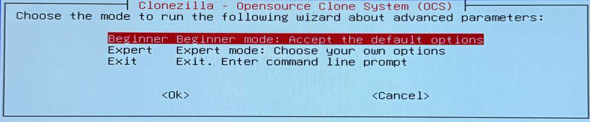 Use the Tab key to highlight the <Ok> or <Cancel> buttons in Clonezilla.