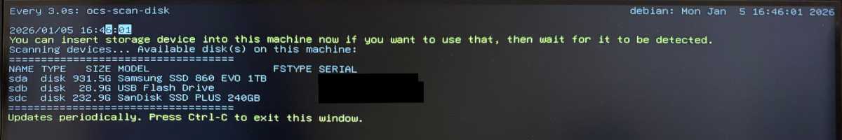 On the next screen, verify the USB where the image will be saved is in the list and note the name (e.g., sdc). Press CTRL+C to exit this screen