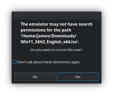 The emulator may not have search permissions from the path ____. Do you want to correct this now?